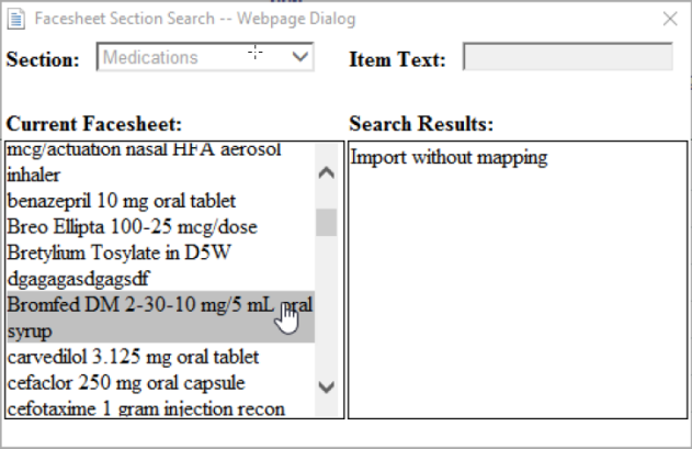 | 6. | Map the selected item from the CCD to an item on the Patient’s Facesheet by selecting an item in the Current Facesheet column. Alternatively, you can select Import without mapping in the Search Results column. |
