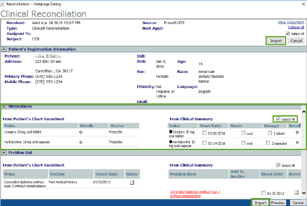 Reconciling Data Automatically by Importing In the Clinical Reconciliation window, you must select at least one item under Demographics, along with any items from the Allergy, Medications, and Problem List sections, before selecting the Import button. |