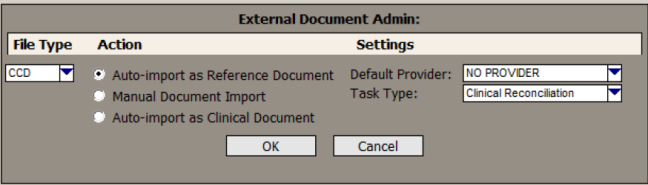 - Auto-import as Reference Document: Selecting this option imports all CCDs to the Reference Documents section of the Facesheet. This gives users the ability to electronically reconcile each CCD. Additionally, this setting prevents users from skipping reconciling and saving the CCD directly to the chart.