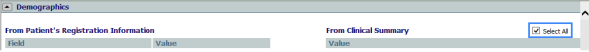 | 8. | Use the check boxes in the From Clinical Summary pane of each section to select the data to import into the patient’s chart. To include all the information from the clinical summary in the patient’s chart, select the Select All check box. |