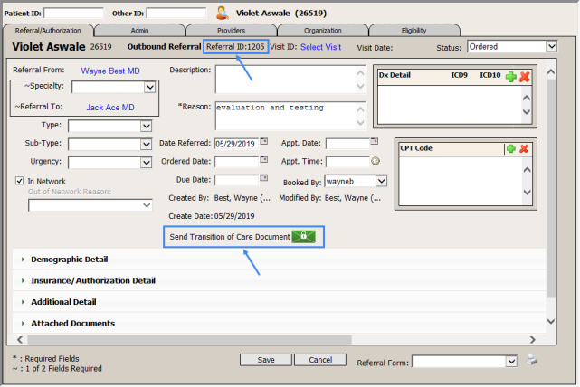 - A transition of care was sent using the Updox – Direct Messaging: CCD system link to the provider the patient’s care is being referred to.