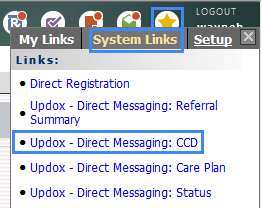 | 1. | Select My Links , select the System Links tab, and then select Updox – Direct Messaging: CCD to open the Transition of Care window. |