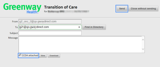 | 8. | Enter the desired Subject and Message. The paperclip icon indicates the CCDA/transition of care document is attached. |