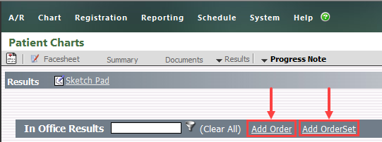 If ordering from the Results section of a Note, you can also select the In-Office tab to add an order from a list of items defined as in-office orders.