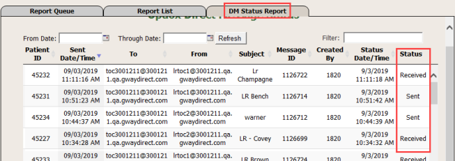Updox is a third-party partner that supplies the ability to send and receive Direct Messages to Prime Suite. The DM Status Report log displays information supplied by Updox. However, Prime Suite cannot use information from this log for measure results. Because of this, you must monitor this report to determine when the other provider received the direct message with the summary of care document. If the message was not received, you must resend the message within the measurement period to qualify a transition of care for this measure.