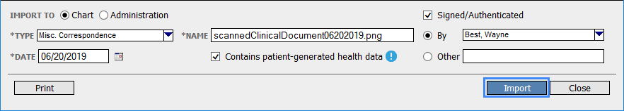 When importing a document from a patient message, you must select the Chart radio button to import to the patient’s chart. Using the Administration option will not qualify the patient for the numerator. |