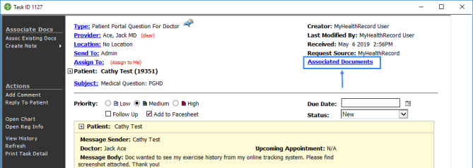 Patient portal messages go into Prime Suite as tasks. These tasks are typically assigned a task type that begins with Patient Portal. Examples of these task types include Patient Portal General Question, Patient Portal Question for Doctor, and Patient Portal Prescription. The sections below provide more information on:
