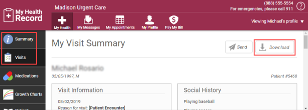 While on the Summary tab or when viewing a selected visit from the Visits tab, the patient can select Download to download their personal health information.
