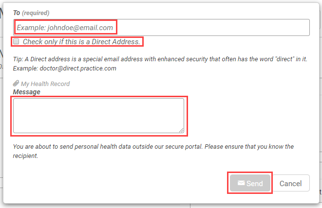 While on the Summary tab or when viewing a selected visit from the Visits tab, patients can select Send to transmit their health information. Patients enter the email address their health information should be sent to. If the patient enters a Direct Address, they select the Check only if this is a Direct Address check box. After entering text into the Message field, they select Send. The patient’s health information is transmitted to the indicated address.